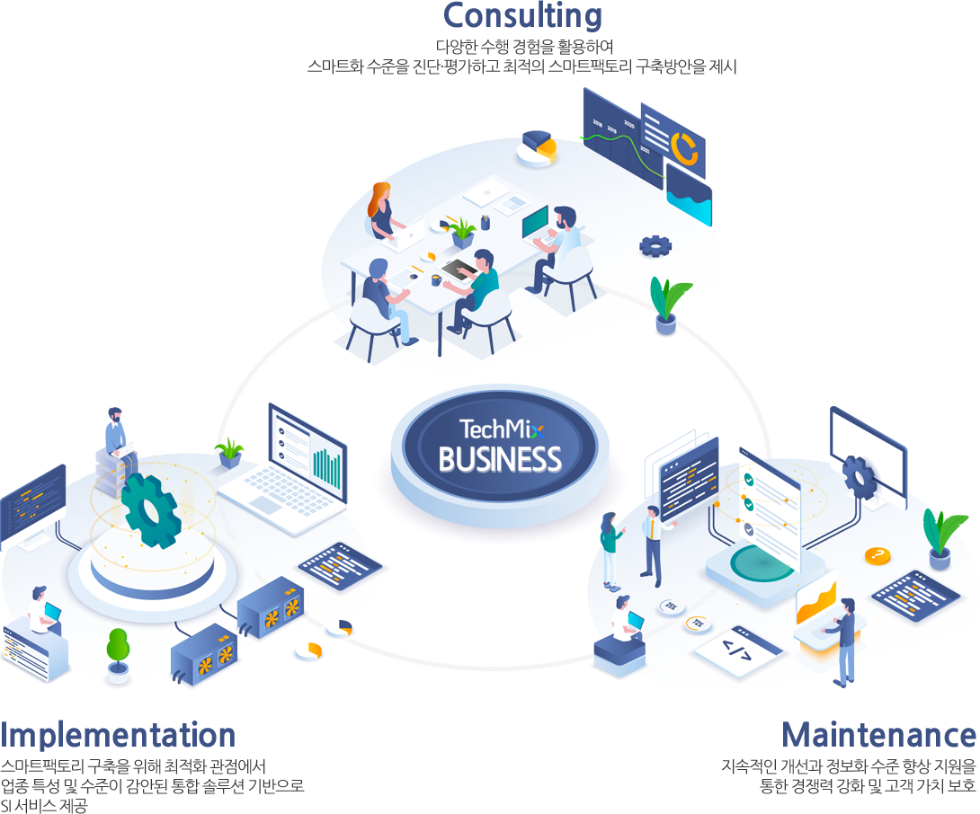 테크믹스는 스마트팩토리 구축을 위한 솔루션 공급, 컨설팅, 시스템 구축, 운영 관리를 제공하고 있습니다. 특히, 국내.외 다양한 제조 사업장에 설치되어 운영중이며, 검증된 기능과 성능 그리고 경험 많은 컨설턴트와 개발자의 참여로 단기간에 안정적인 시스템 구축을 약속드립니다.