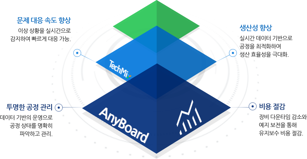 AnyBOARD는 제조 현장에서 발생하는 데이터를 실시간으로 수집, 분석, 시각화하여 공정 상태, 생산 효율성, 품질 관리를 최적화하는 시스템입니다. 이를 통해 생산 공정을 투명하게 모니터링하고, 문제를 신속히 파악하여 대응할 수 있습니다.