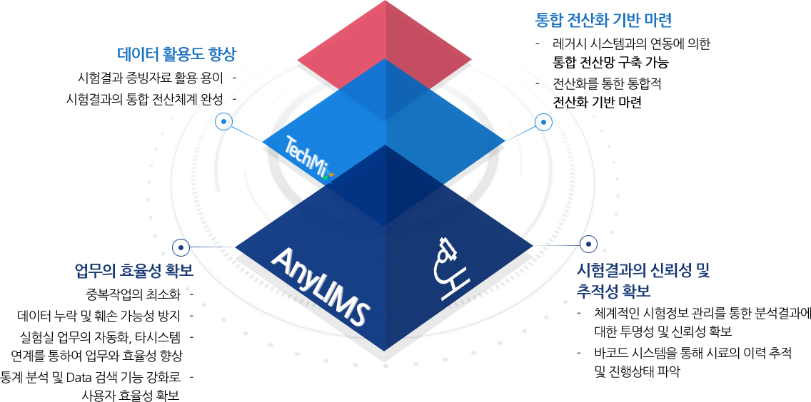 AnyLIMS는 실험 및 분석업무를 진행하는 정보관리 시스템으로 연구개발(R&D) 실험실이나 공정관리 실험실, 품질관리 실험실, 각종 검사 실험실에서 생성 또는 사용되는 정보를 저장하고, 저장된 데이터를 관리하며, 사용자가 원하는 형식으로 조회하여 활용할 수 있는 시스템입니다. LIMS는 통해 시험 의뢰부터 시험결과 승인 및 성적서 발생까지 샘플의 life cycle 전 과정을 체계적으로 관리할 수 있으며, 이 데이터에는 실험 데이터뿐만 아니라 데이터의 신뢰성을 확보하고 각종 규정에 적합한 실험실을 운영하기 위해서 필요한 모든 정보를 포함합니다