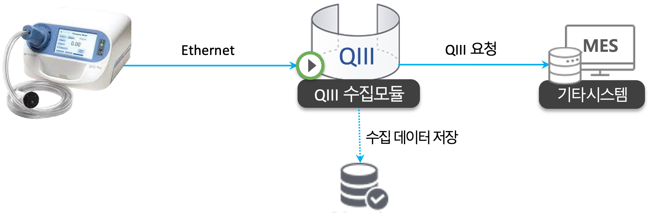 QIII 연동 모듈은 QIII에서 측정한 데이터를 주기적 또는 필요 시점에 측정 데이터를 수집하여 DB화 하여 분석보고서 자료를 제공하고, 필요시 MES등 연계 시스템을 실시간 데이터 연동을 제공합니다.